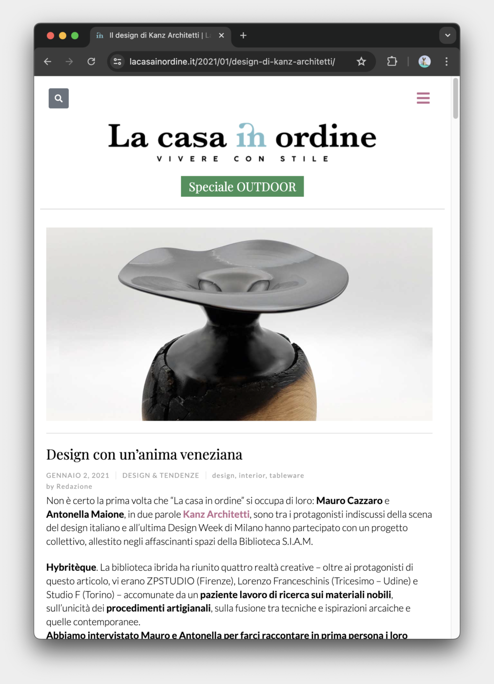 Non è certo la prima volta che “La casa in ordine” si occupa di loro: Mauro Cazzaro e Antonella Maione, in due parole Kanz Architetti, sono tra i protagonisti indiscussi della scena del design italiano e all’ultima Design Week di Milano hanno partecipato con un progetto collettivo, allestito negli affascinanti spazi della Biblioteca S.I.A.M. Hybritèque. La biblioteca ibrida ha riunito quattro realtà creative – oltre ai protagonisti di questo articolo, vi erano ZPSTUDIO (Firenze), Lorenzo Franceschinis (Tricesimo – Udine) e Studio F (Torino) – accomunate da un paziente lavoro di ricerca sui materiali nobili, sull’unicità dei procedimenti artigianali, sulla fusione tra tecniche e ispirazioni arcaiche e quelle contemporanee.