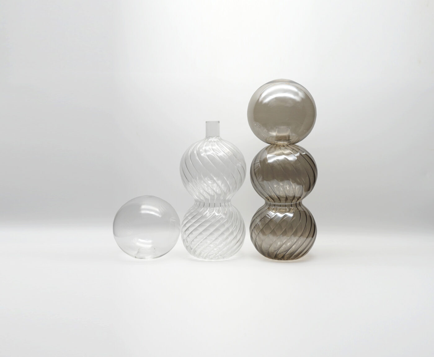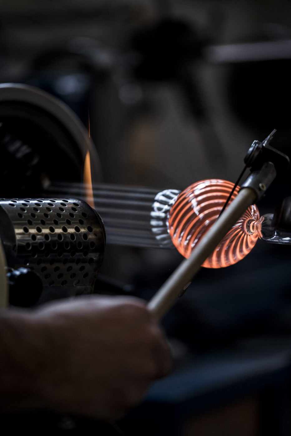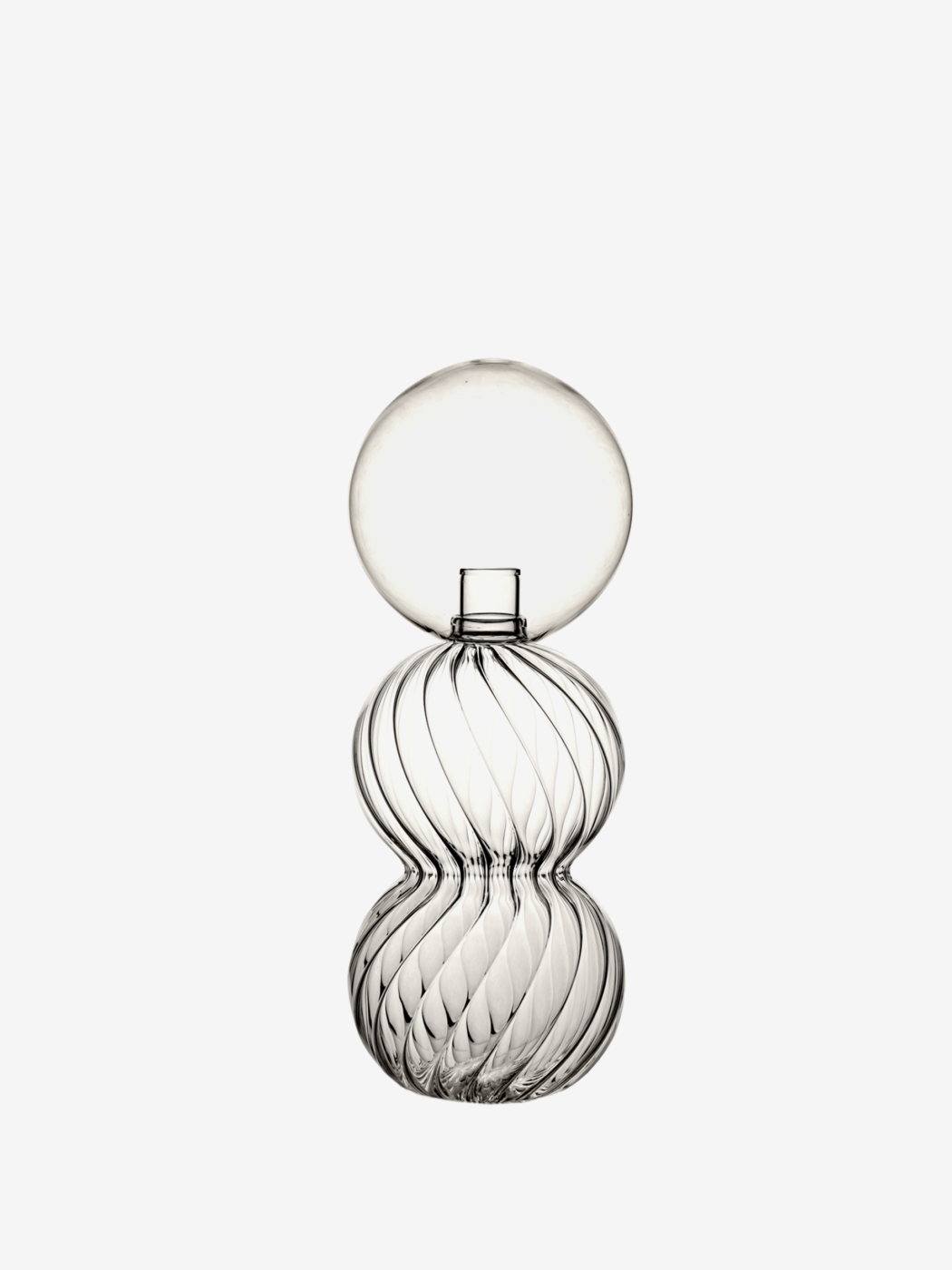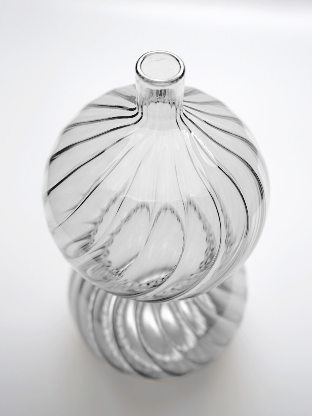 Calabaza (a single word that in Spanish stands for pumpkin / flask), a bottle that refers to archetypal forms derived from the natural world, whose volutes obtained by blowing glass give rise to a living object that appears to be constantly changing. The blowing of the striped glass and the plays of light reflection that derive from it transport the memory to certain decorative motifs of the Venetian chandeliers.