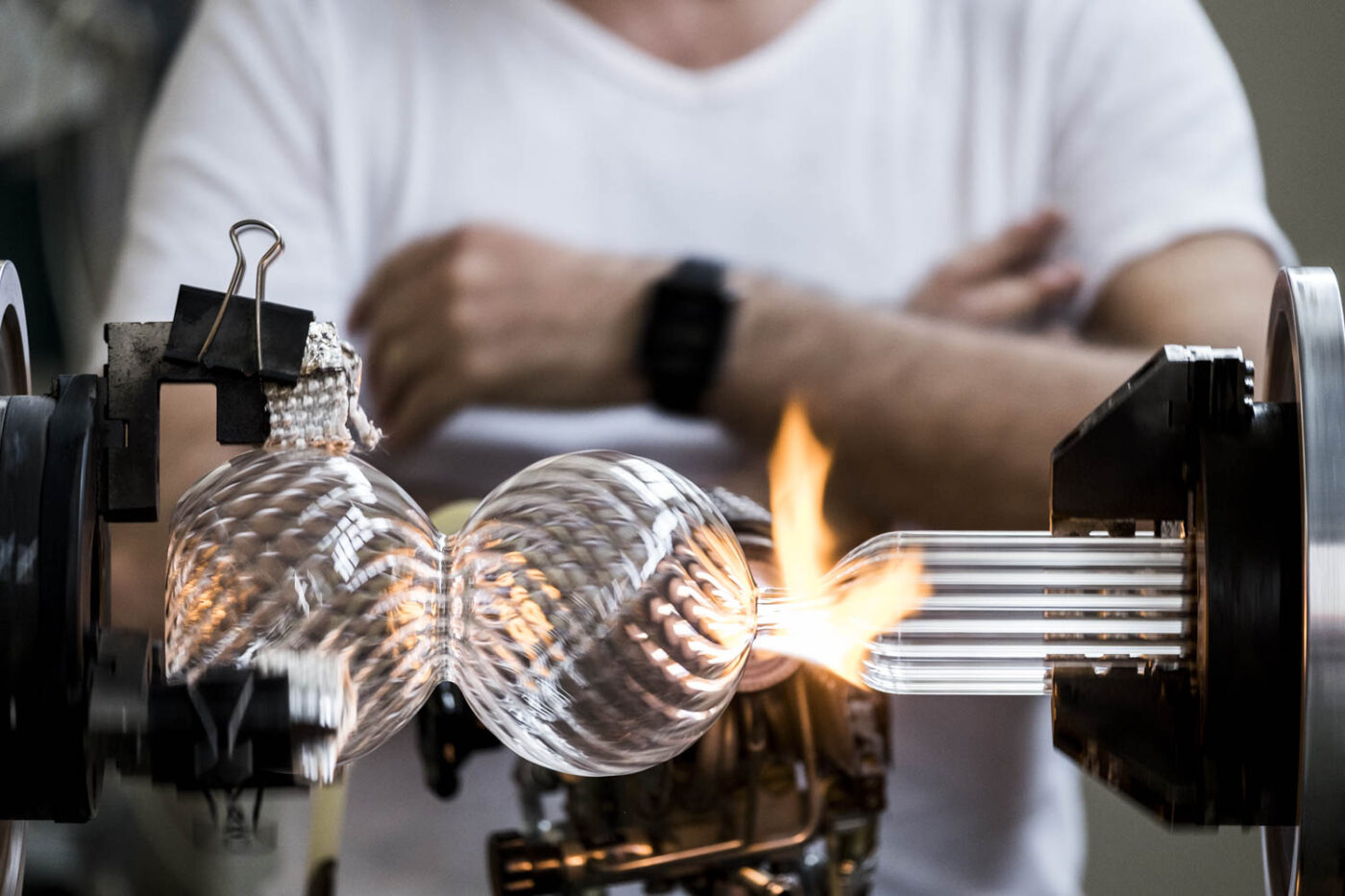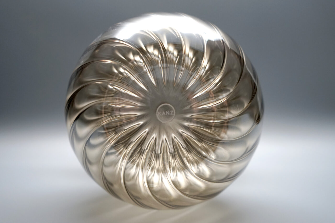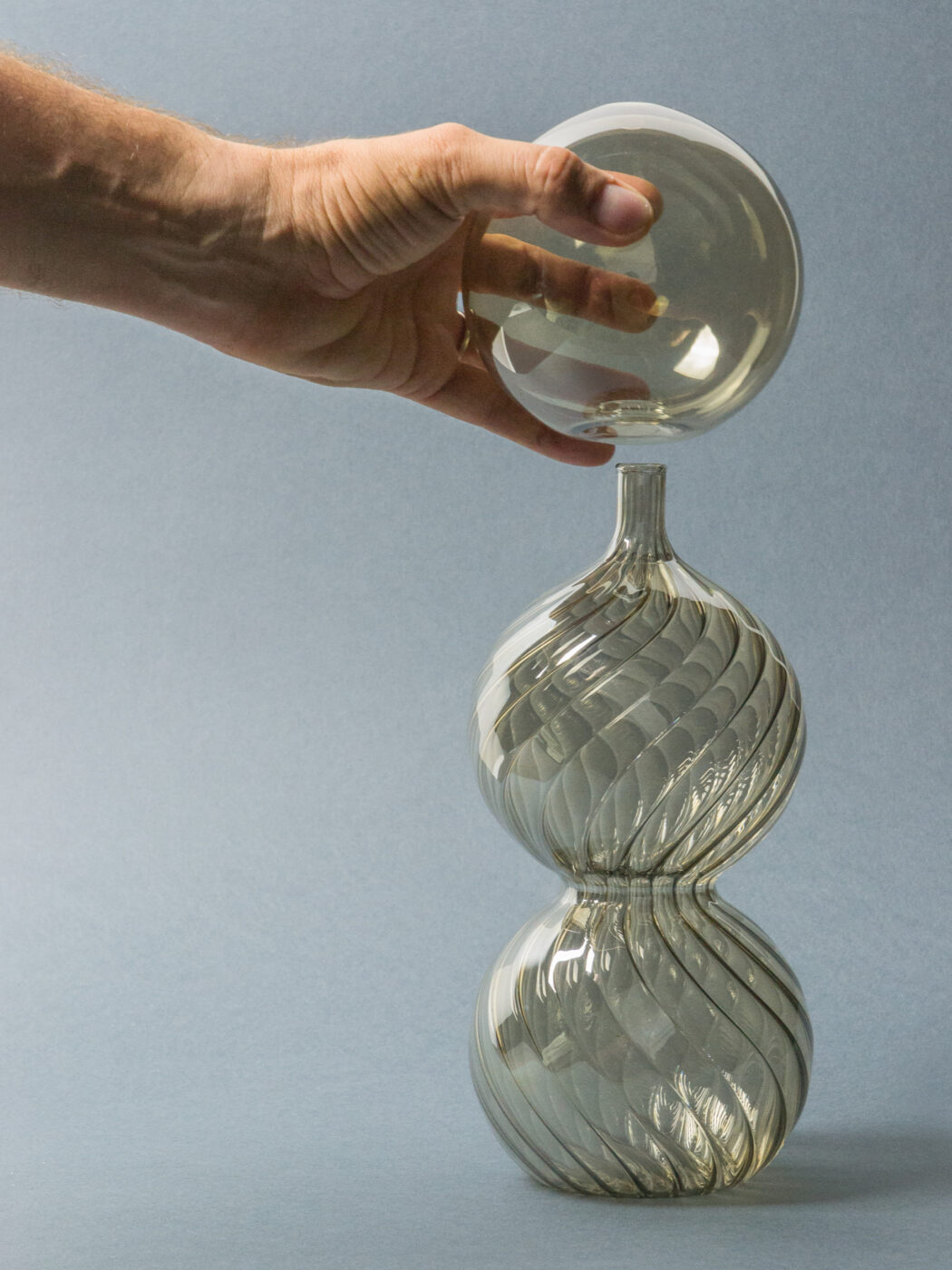 Calabaza (un’unica parola che in spagnolo sta per zucca/borraccia), una bottiglia che rimanda a forme archetipiche ricavate dal mondo naturale, le cui volute ottenute dalla soffiatura del vetro danno origine ad un oggetto vivo che appare in continuo mutamento. La soffiatura del vetro rigato e i giochi di riflessione luminosa che ne derivano trasportano la memoria a certi motivi decorativi dei lampadari veneziani.