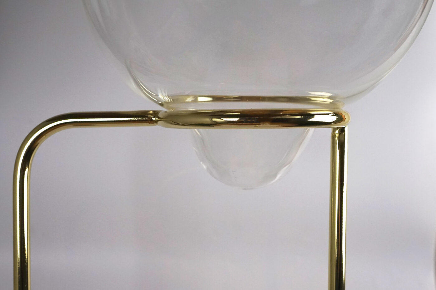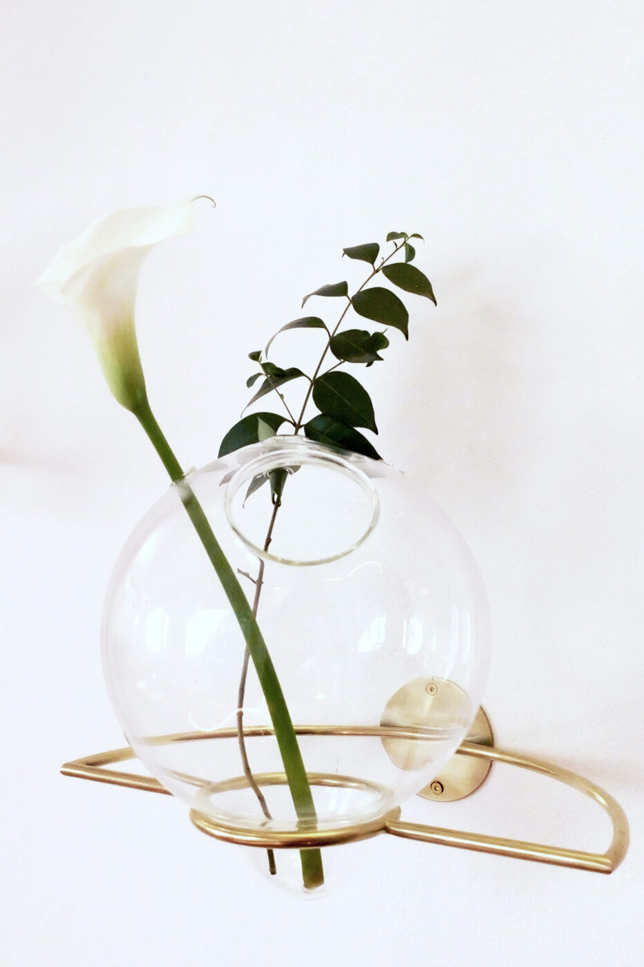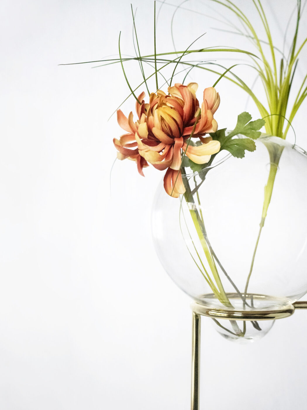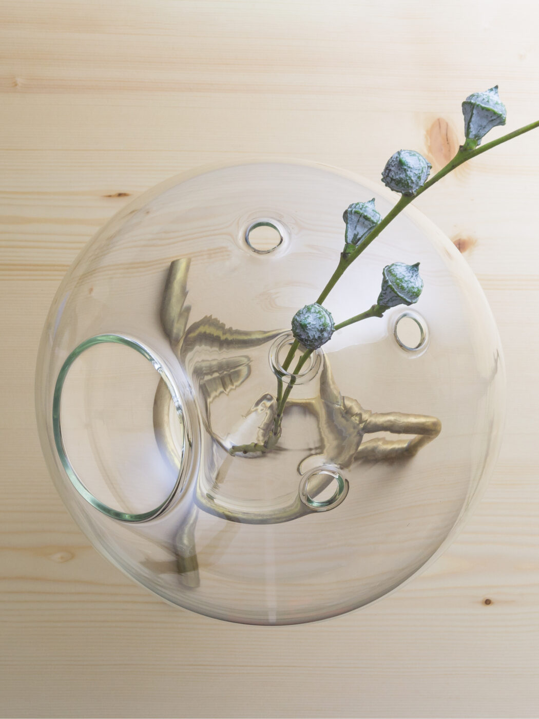 Il vaso “Fugu” è parte del progetto Ikebana per principianti, è la traduzione di un concept che vuole confondere i limiti della funzione di un prodotto con la libertà emotiva scaturita dal coinvolgimento dell’utente. Prendono così vita oggetti che non sono più statiche espressioni di un motivo già noto, ma vere e proprie architetture in divenire, esili composizioni in vetro e metallo che hanno come scopo primario l’esaltazione dei fiori recisi. Non si tratta di celebrarne soltanto il valore estetico, ma di condurre a nuova vita il fiore ricostituendone artificialmente la struttura di pianta viva. Le forme architettoniche derivate sono frutto di un percorso nuovo, in cui la progettazione di un vaso – se ancora di vaso si può parlare – sovverte tutte le regole e si concentra sul concetto di “sostenere” anziché sul bisogno di “contenere”.