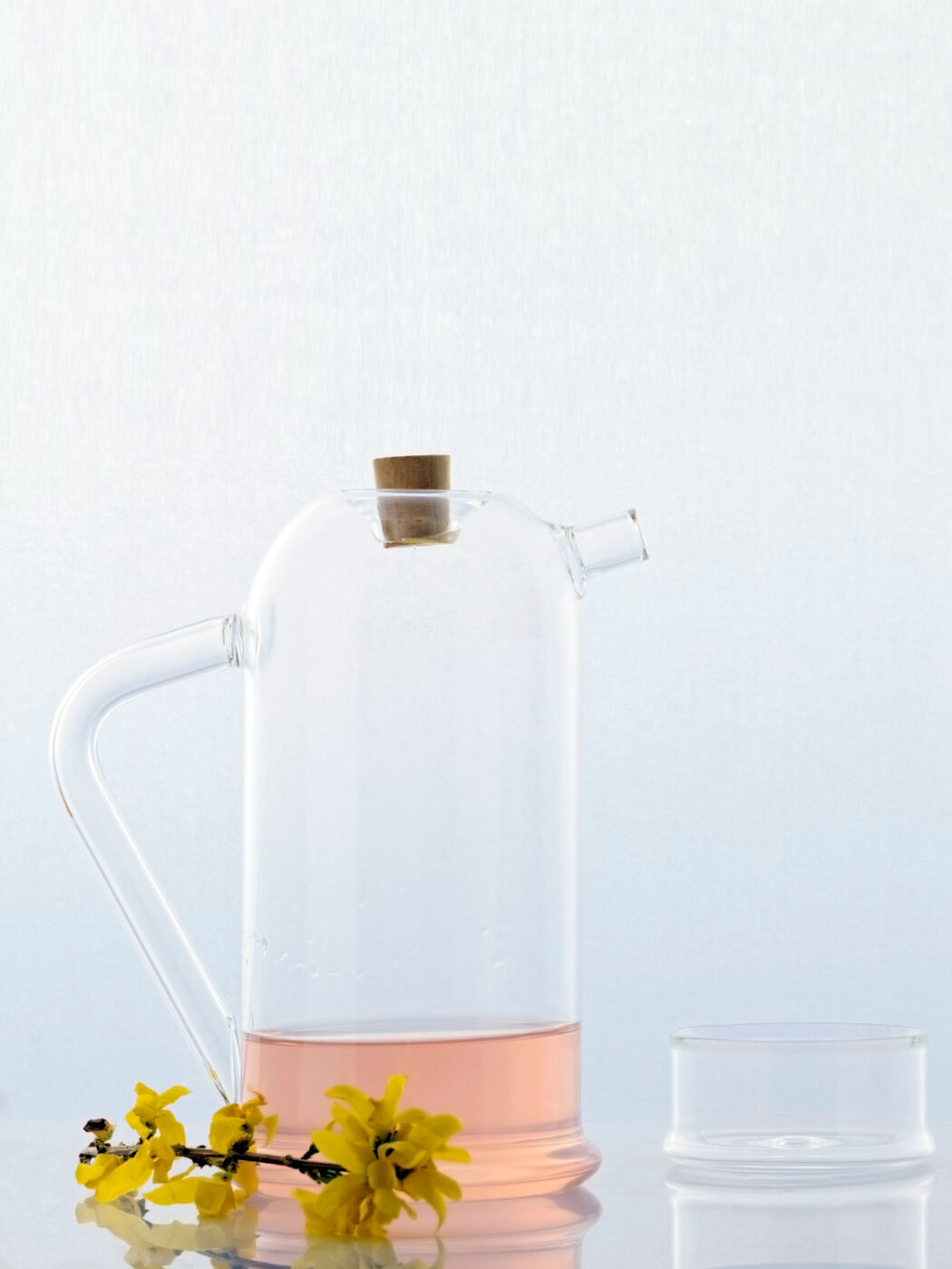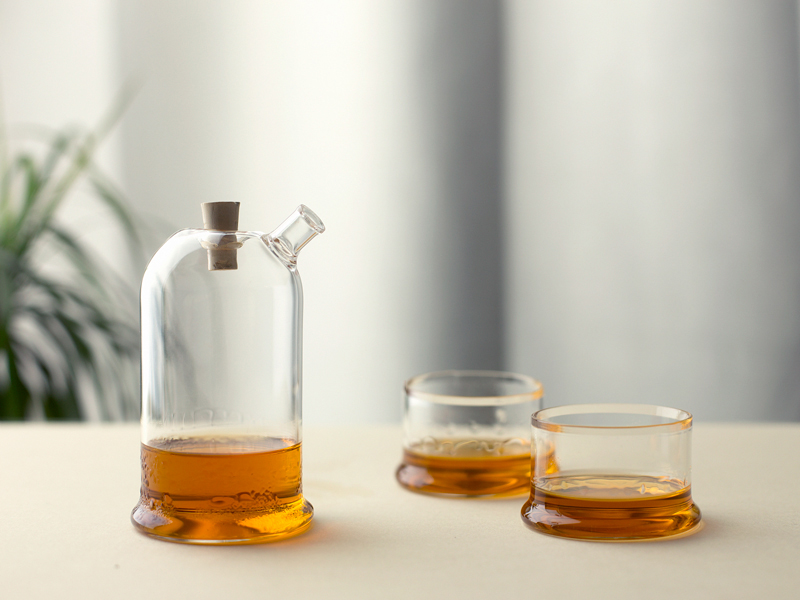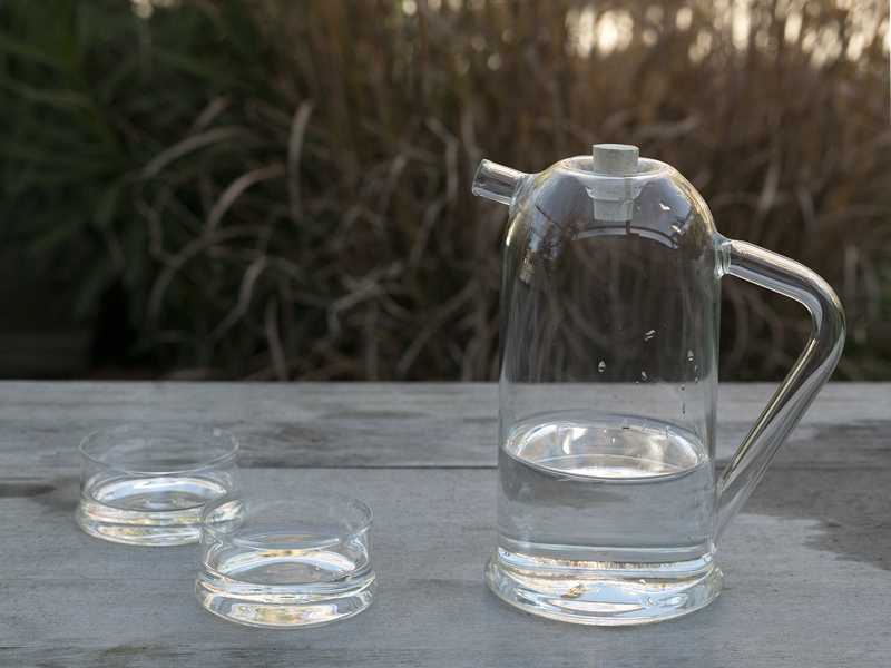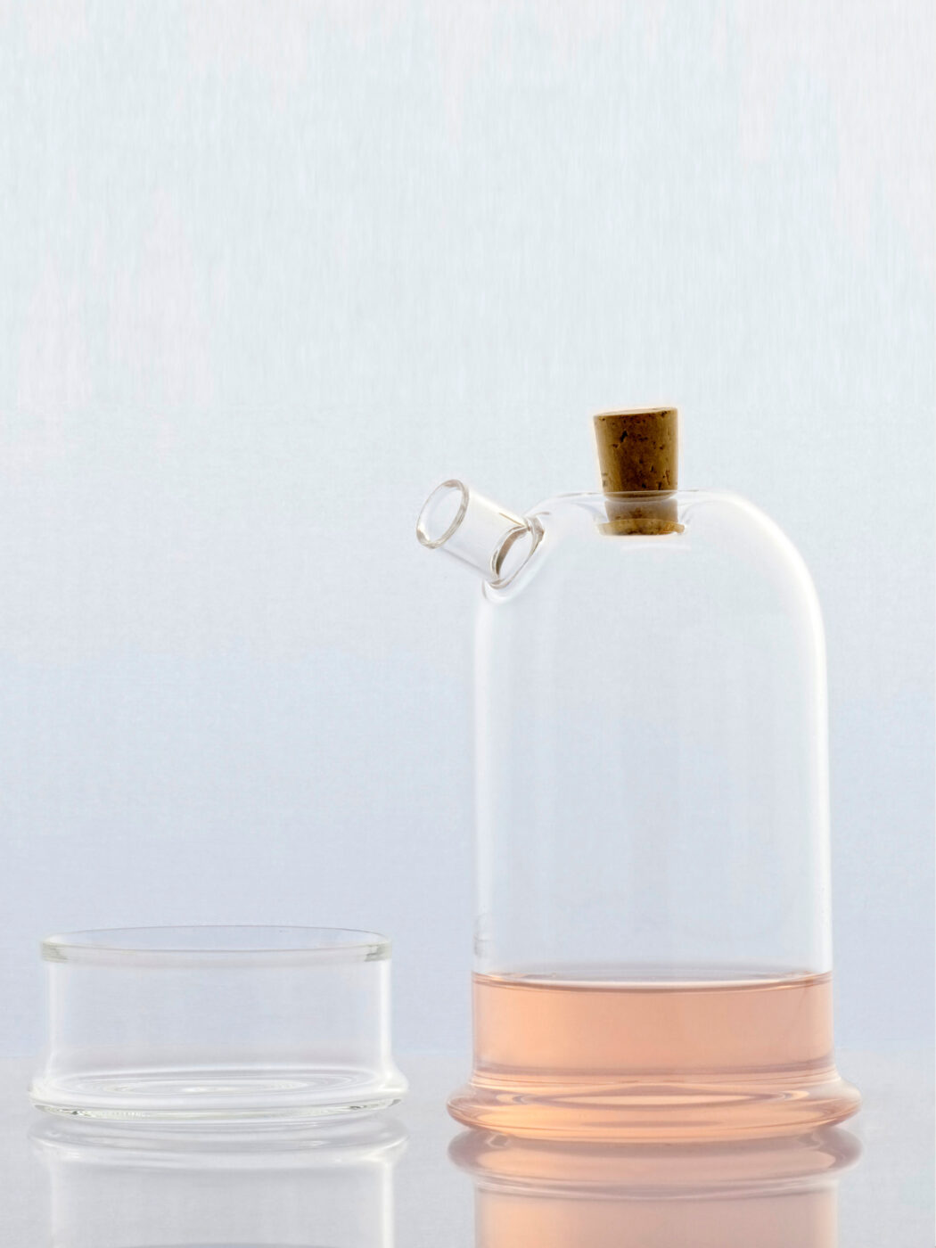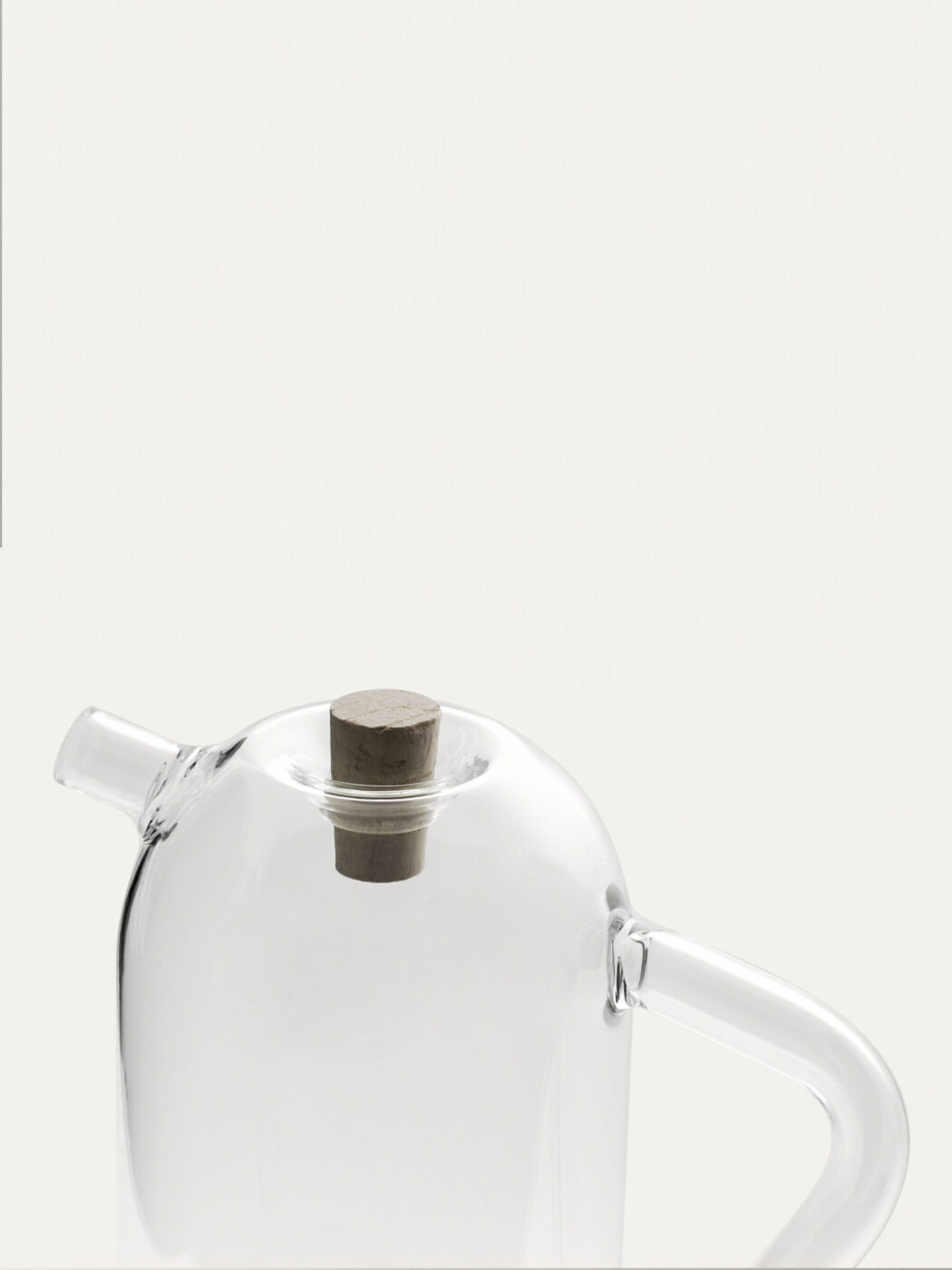 The distinctive shape of Gugo comes from a breath, the one of the glass Master. Gugo is made by elegant details and soft shapes, the purity of the glass body contrasts with the cork, tiny in size but highly distinctive in the context of total transparency.