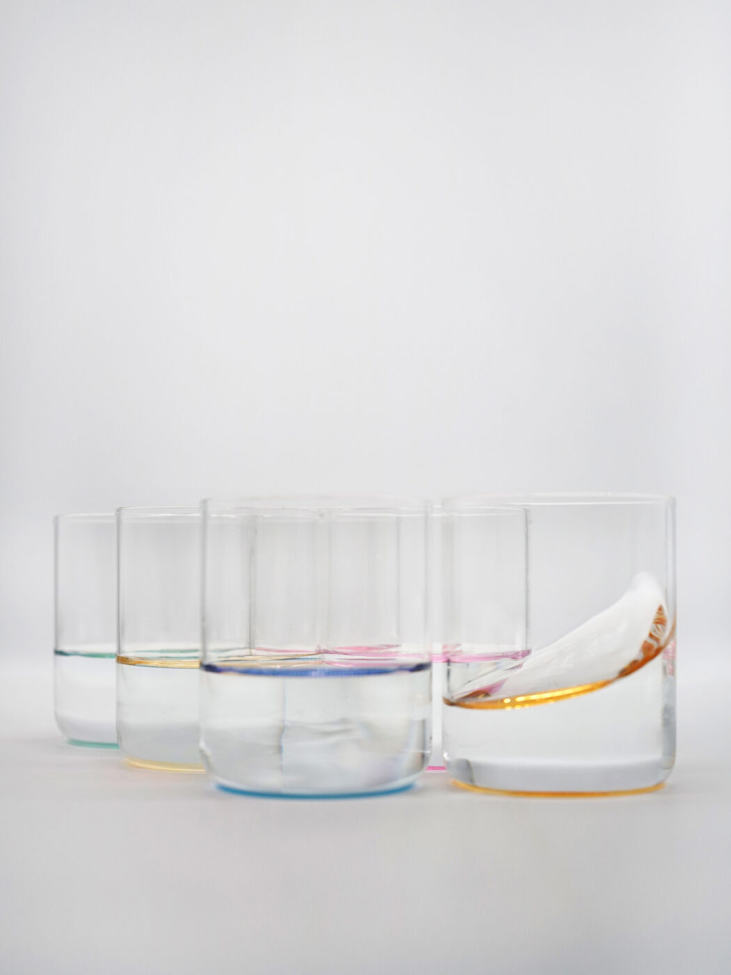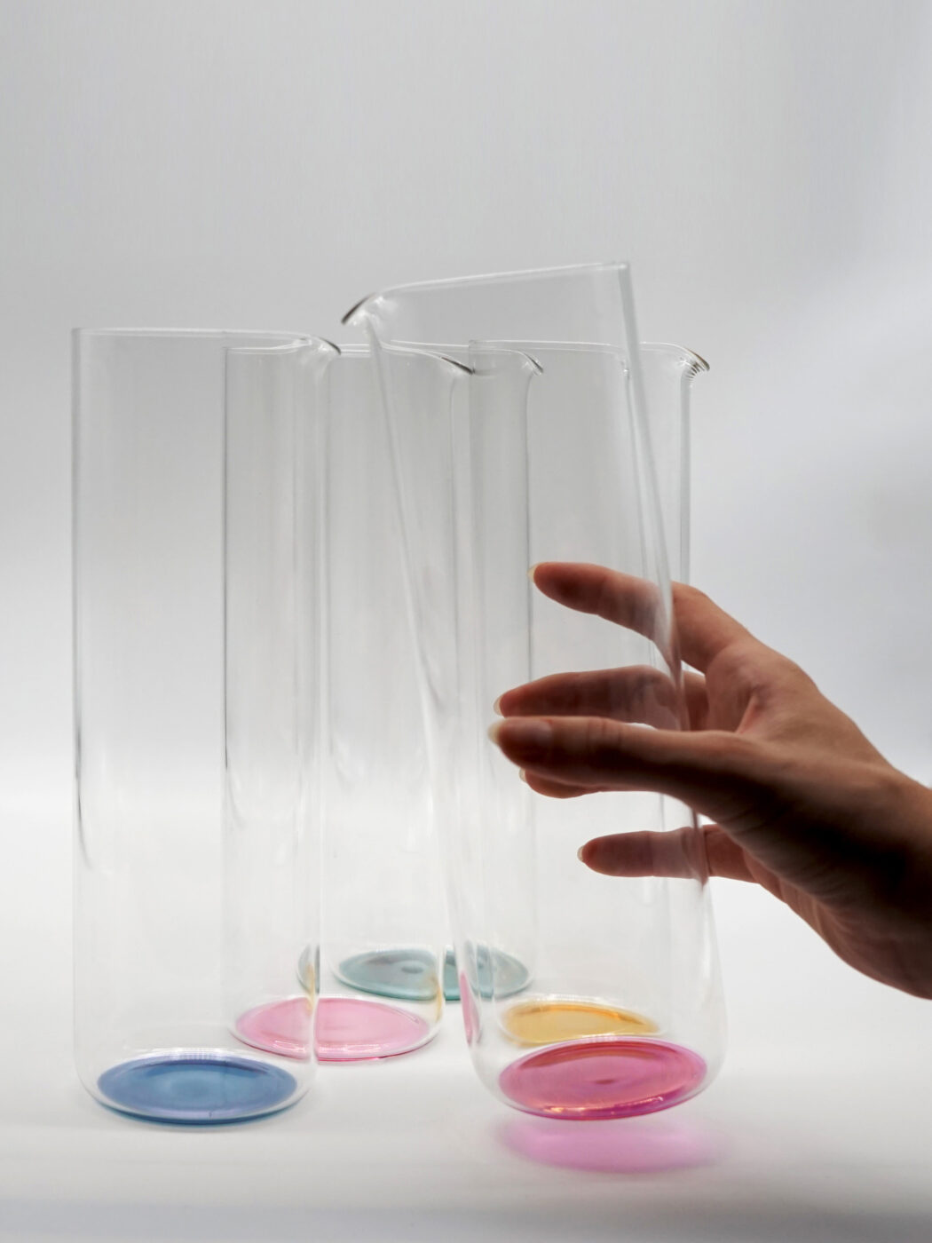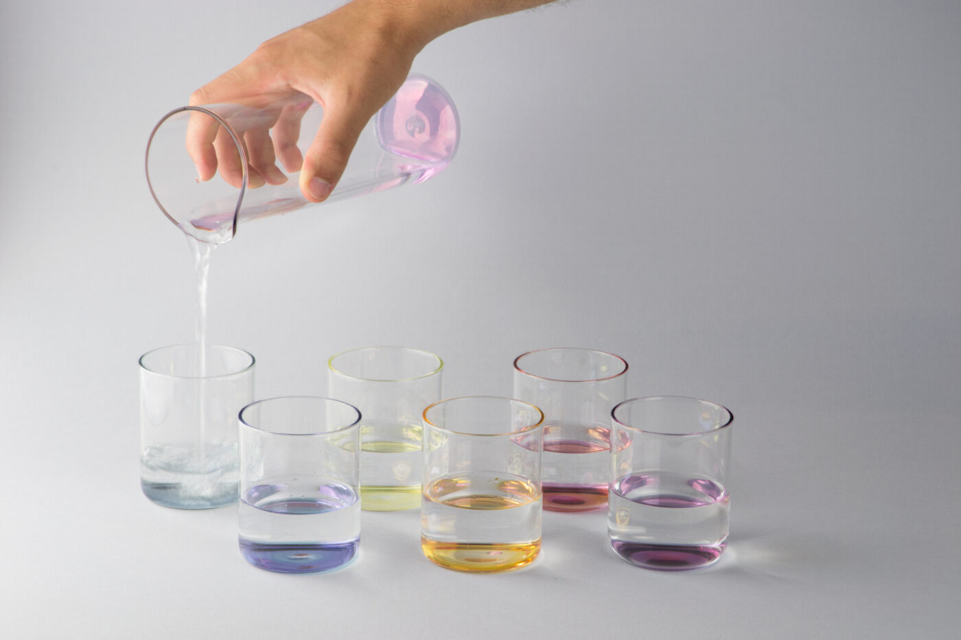 Gli elementi della collezione “Iride” sfruttano il fenomeno della rifrazione luminosa e giocano con il colore del fondo trasportandolo in superficie. Iride è fatto per l’acqua, liquido perfetto per l’esperimento, l’acqua perde la sua essenza trasparente ed assume le 6 colorazioni desiderate, trasformando la tavola in una tavolozza.