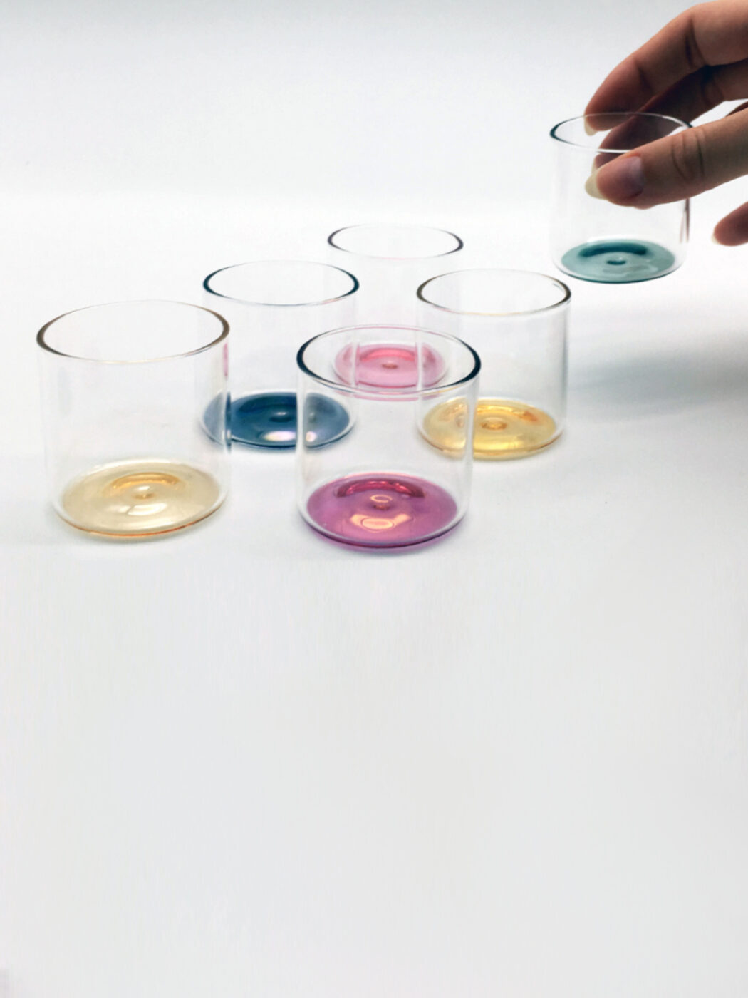 The elements of the “Iride” collection exploit the phenomenon of light refraction and play with the bottom color, transporting it to the surface. Iride is made for the water, perfect liquid for the experiment, which loses its transparent essence and assumes the 6 colors you want, transforming the table into a palette.