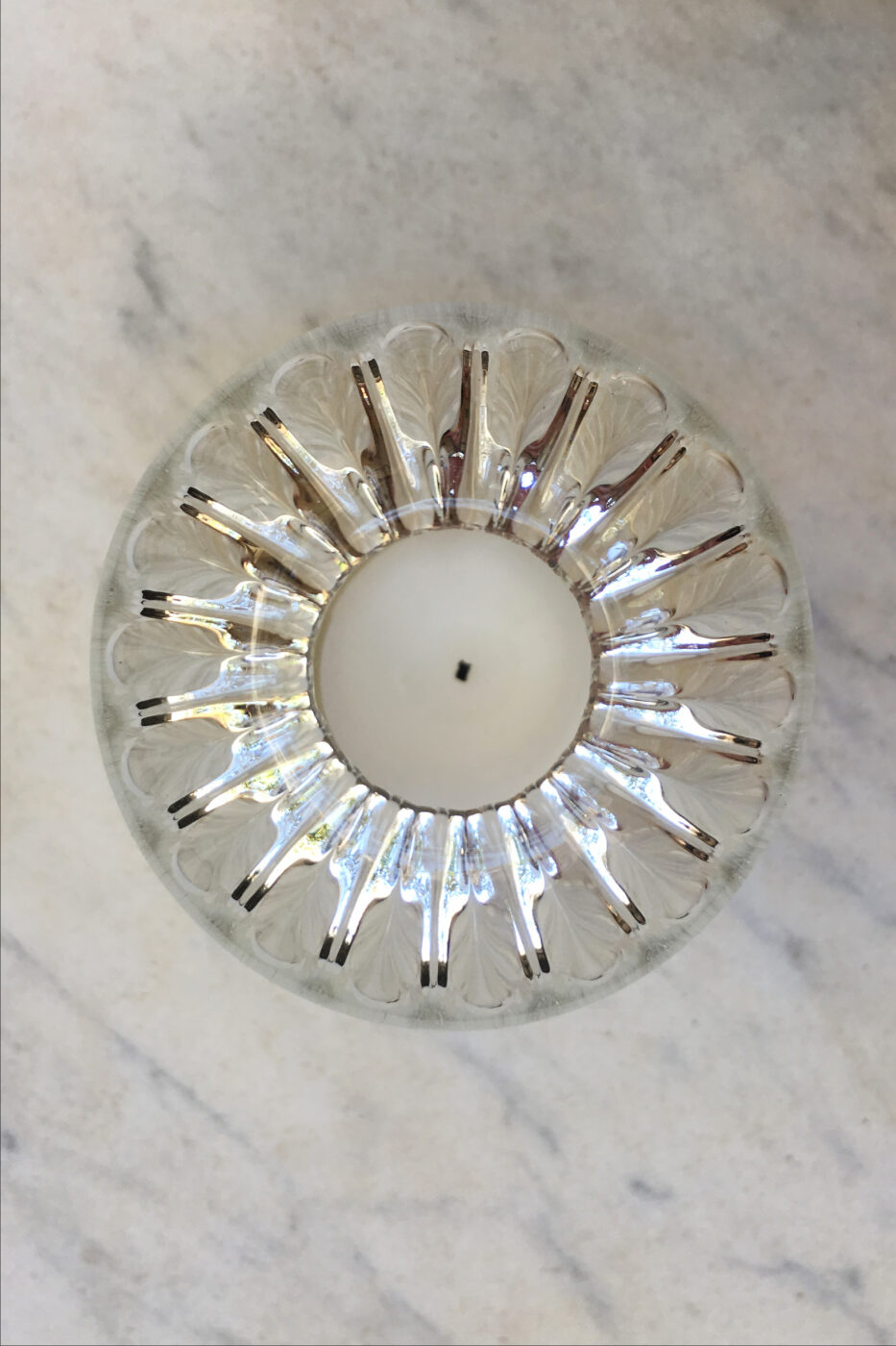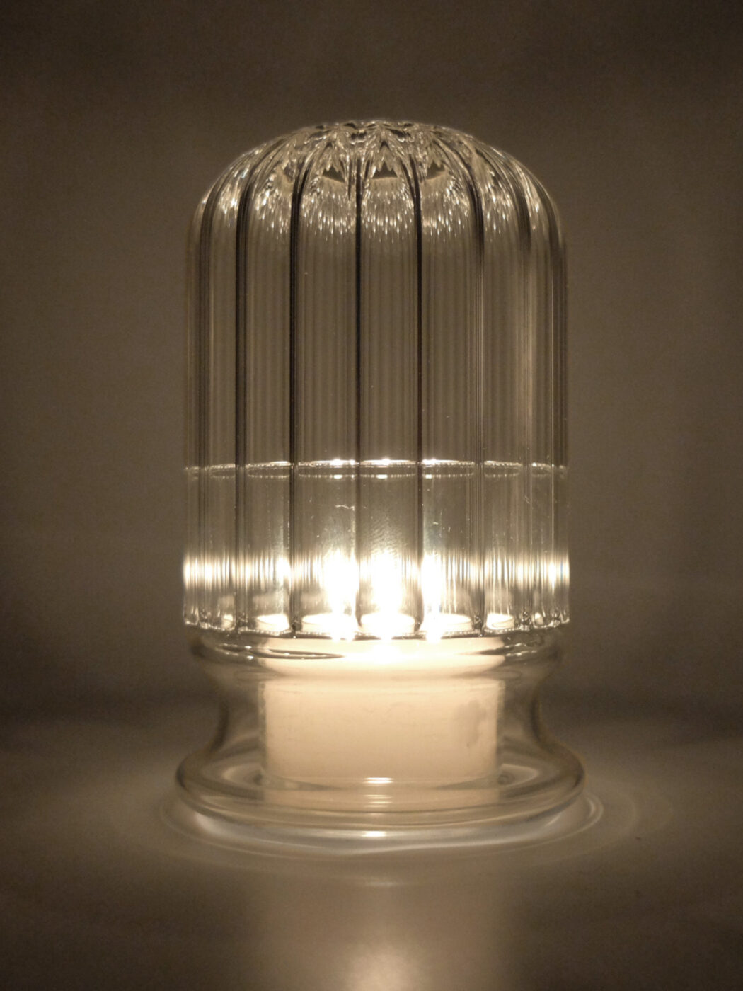 Handmade borosilicate glass candleholder, suitable for outdoor use.