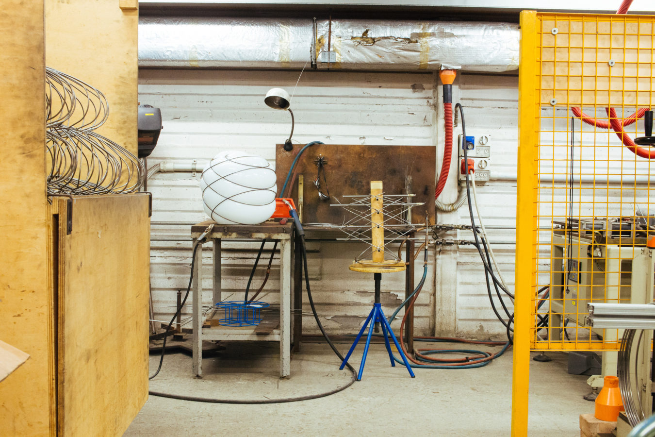 The frame of a moment, a fixed movement, the circles of a metal cage frame are slipping, they are falling down and blown glass is holding them in mid-air. A seemingly random texture is the result of precise geometry. A form that leaves room for imagination similar to clouds that always suggest ever changing images and visions.