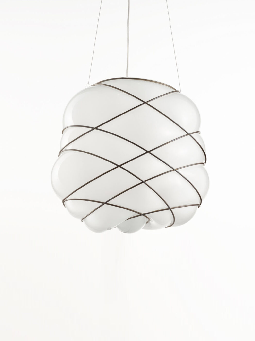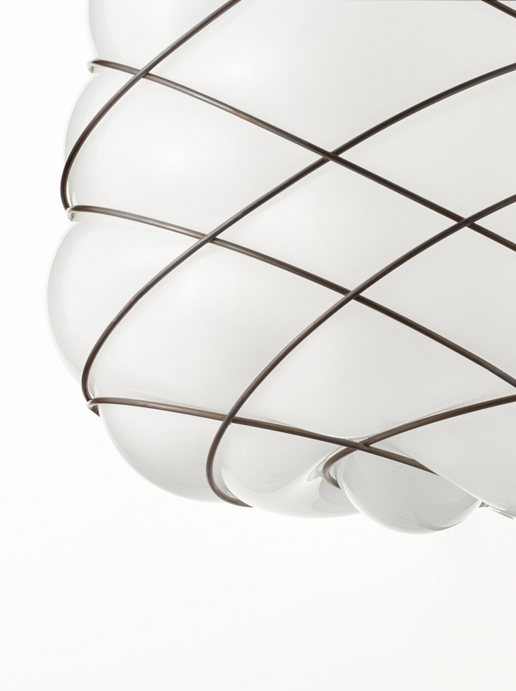 Il fotogramma di un attimo, un movimento fissato, i cerchi della gabbia metallica scivolano, cadono ed il vetro soffiato li sorregge a mezz’aria. Una texture apparentemente casuale è il risultato di una geometria precisa. Una forma che lascia spazio all’immaginazione come quando le nuvole ci suggeriscono sempre nuove visioni.