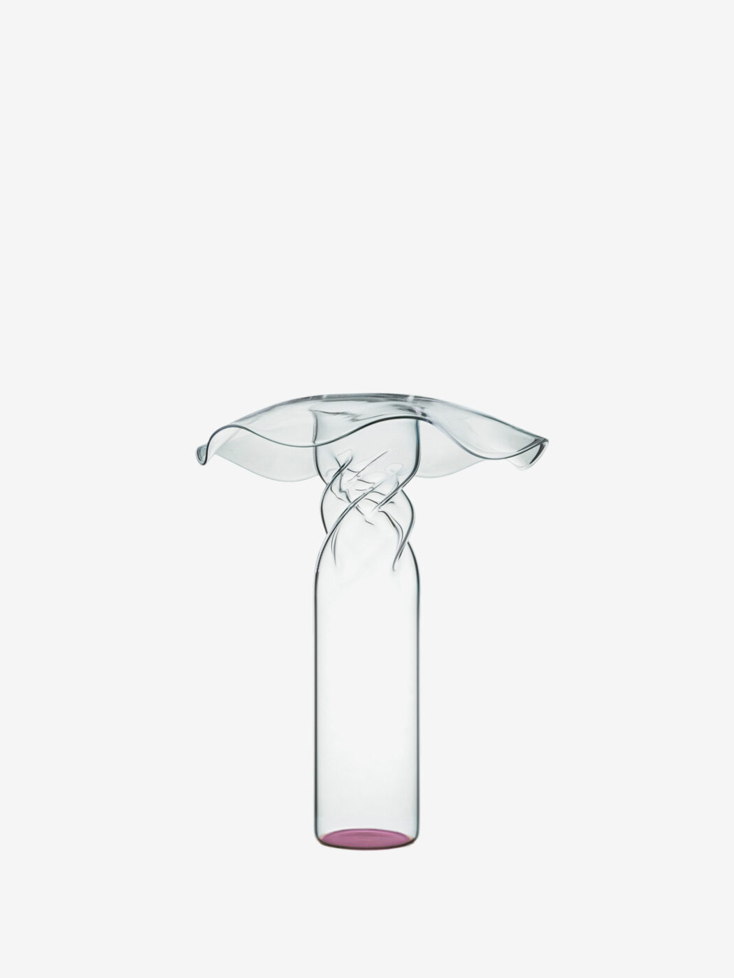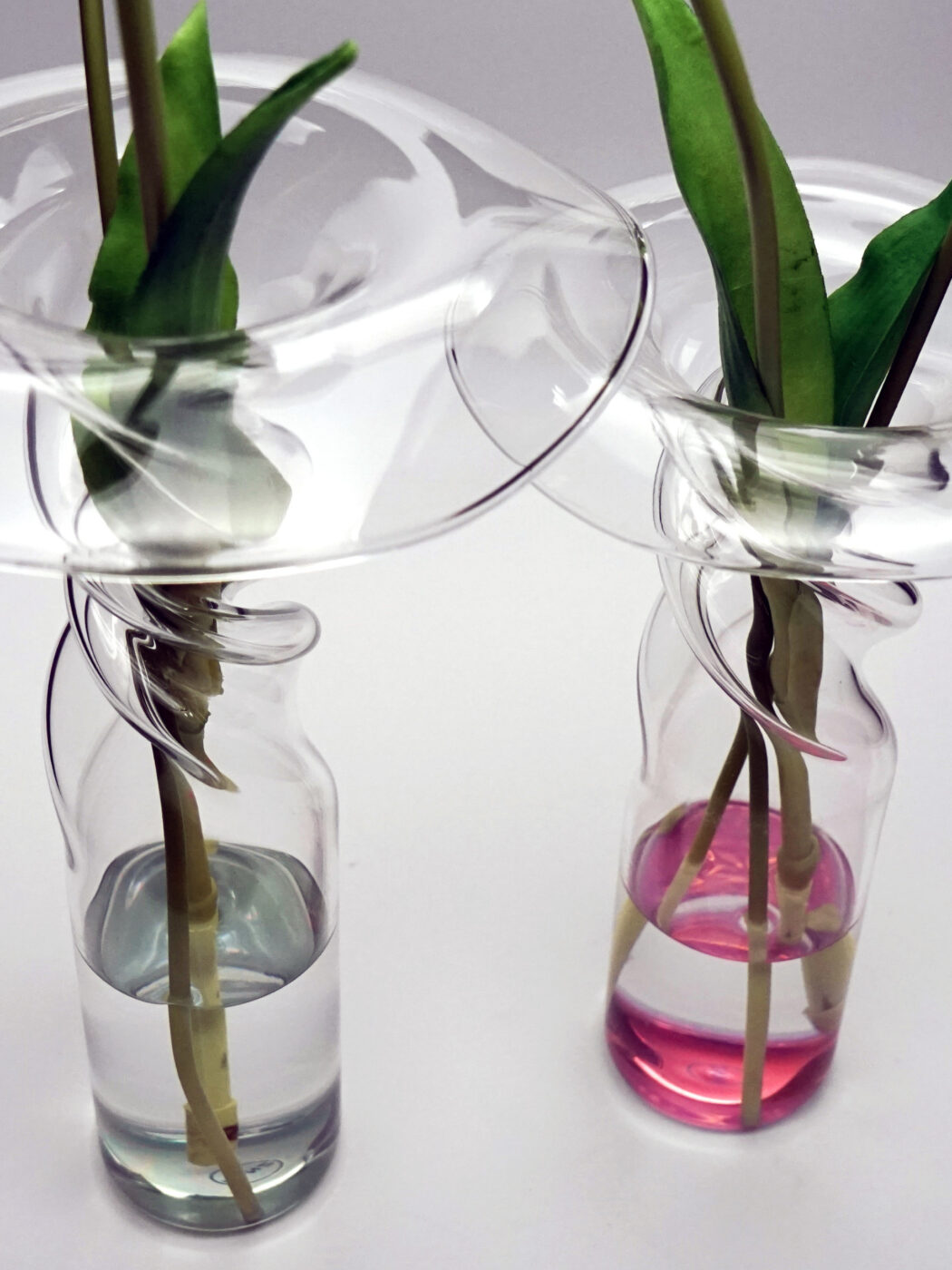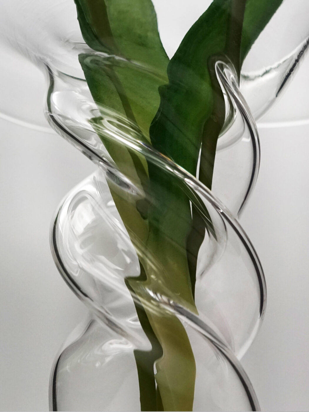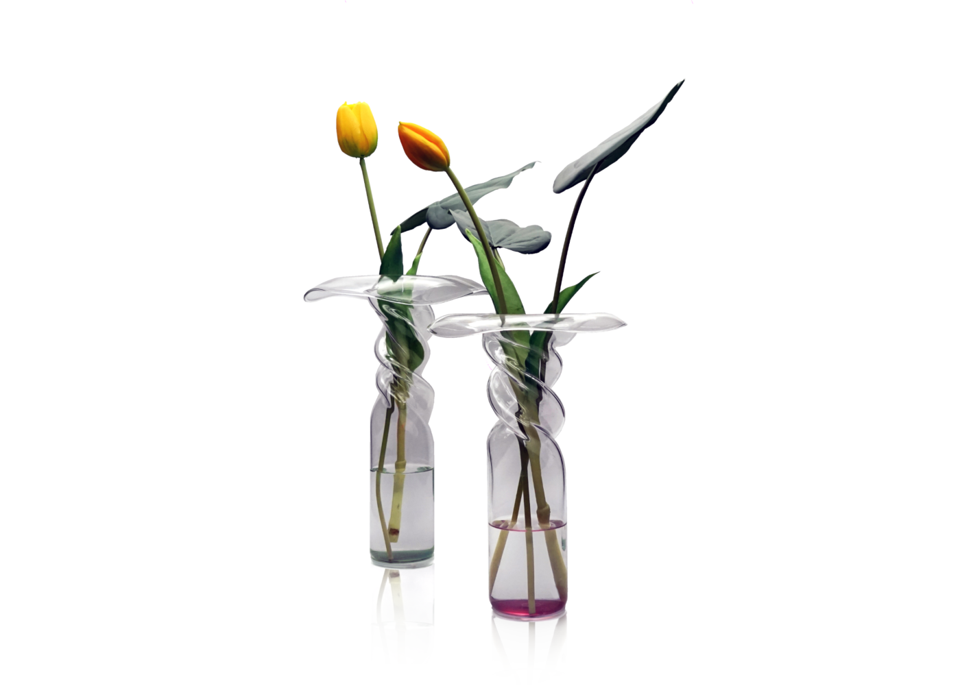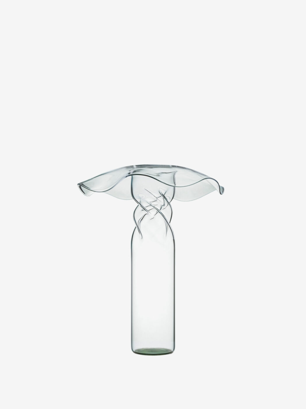 Organically inspired glass vase designed to be a delicate accent for the home. It is characterised by a coloured background that gives the water a slight nuance.