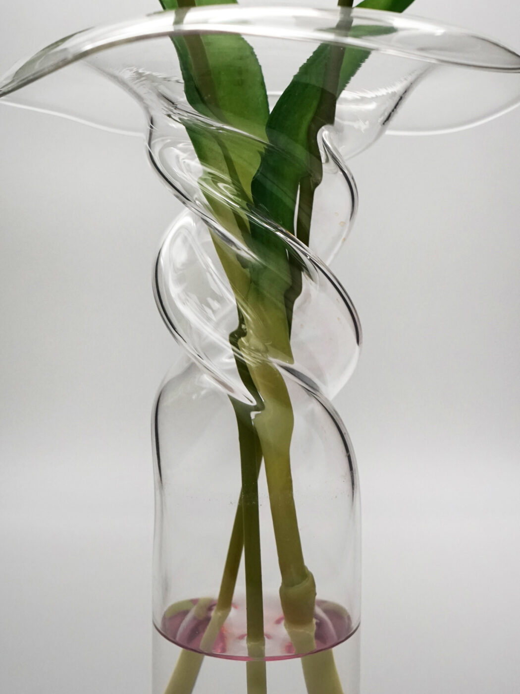 Vaso in vetro di ispirazione organica progettato per essere un delicato accento per la casa. È caratterizzato da uno sfondo colorato che dà all’acqua una leggera sfumatura.