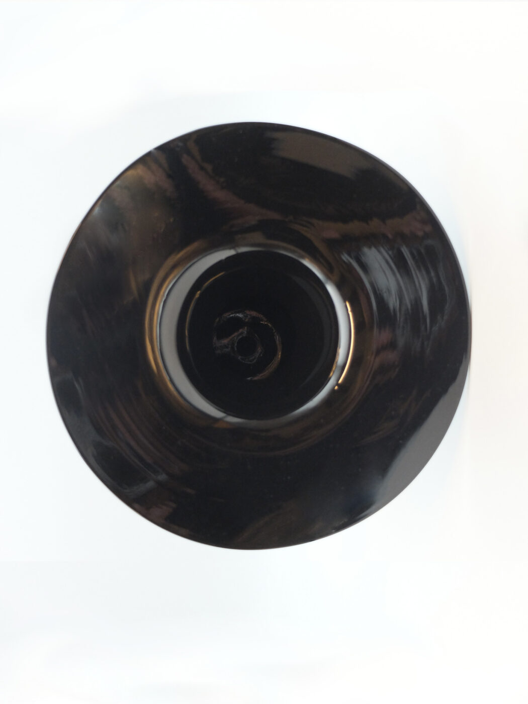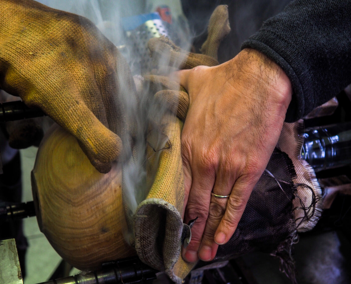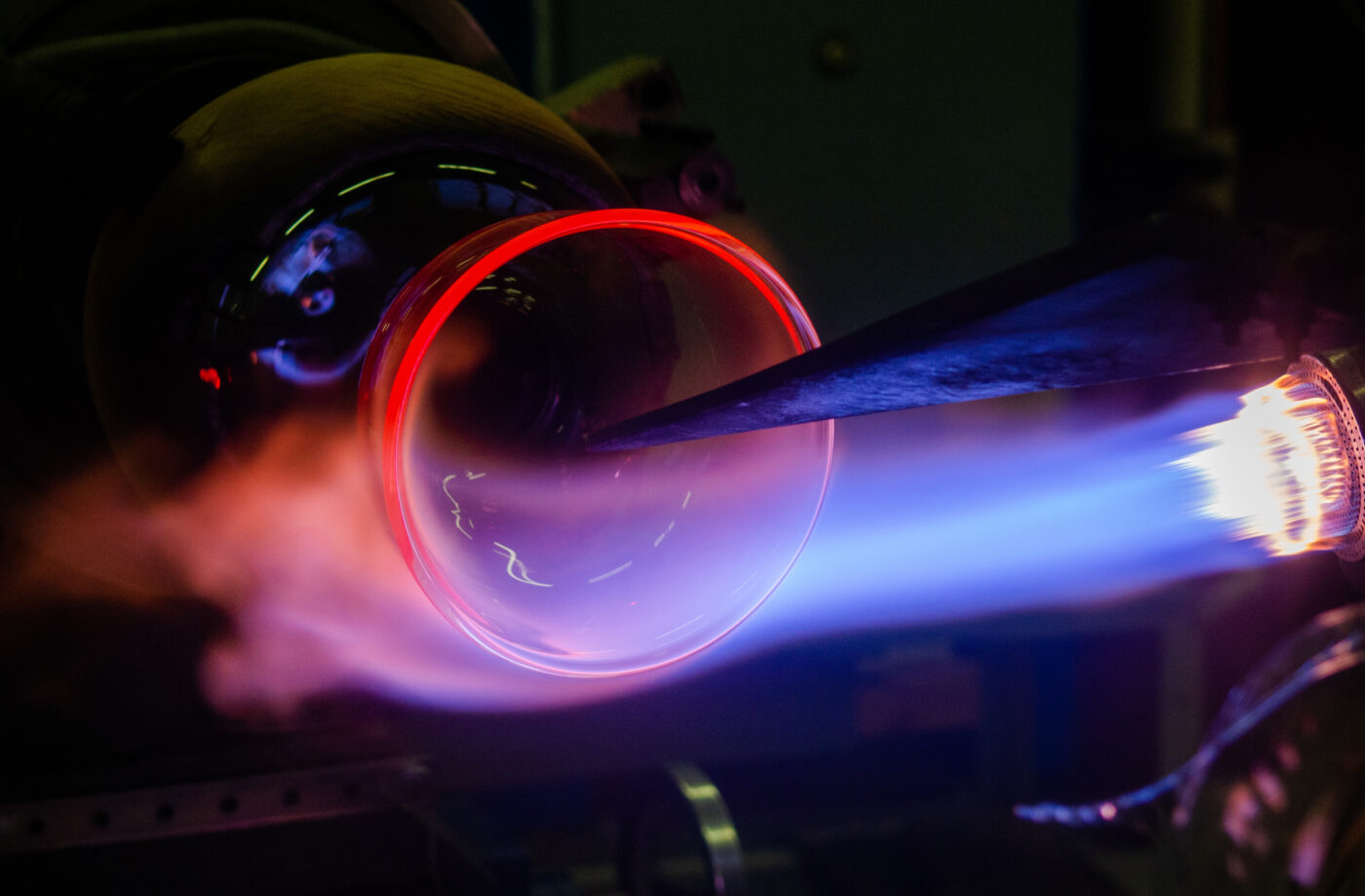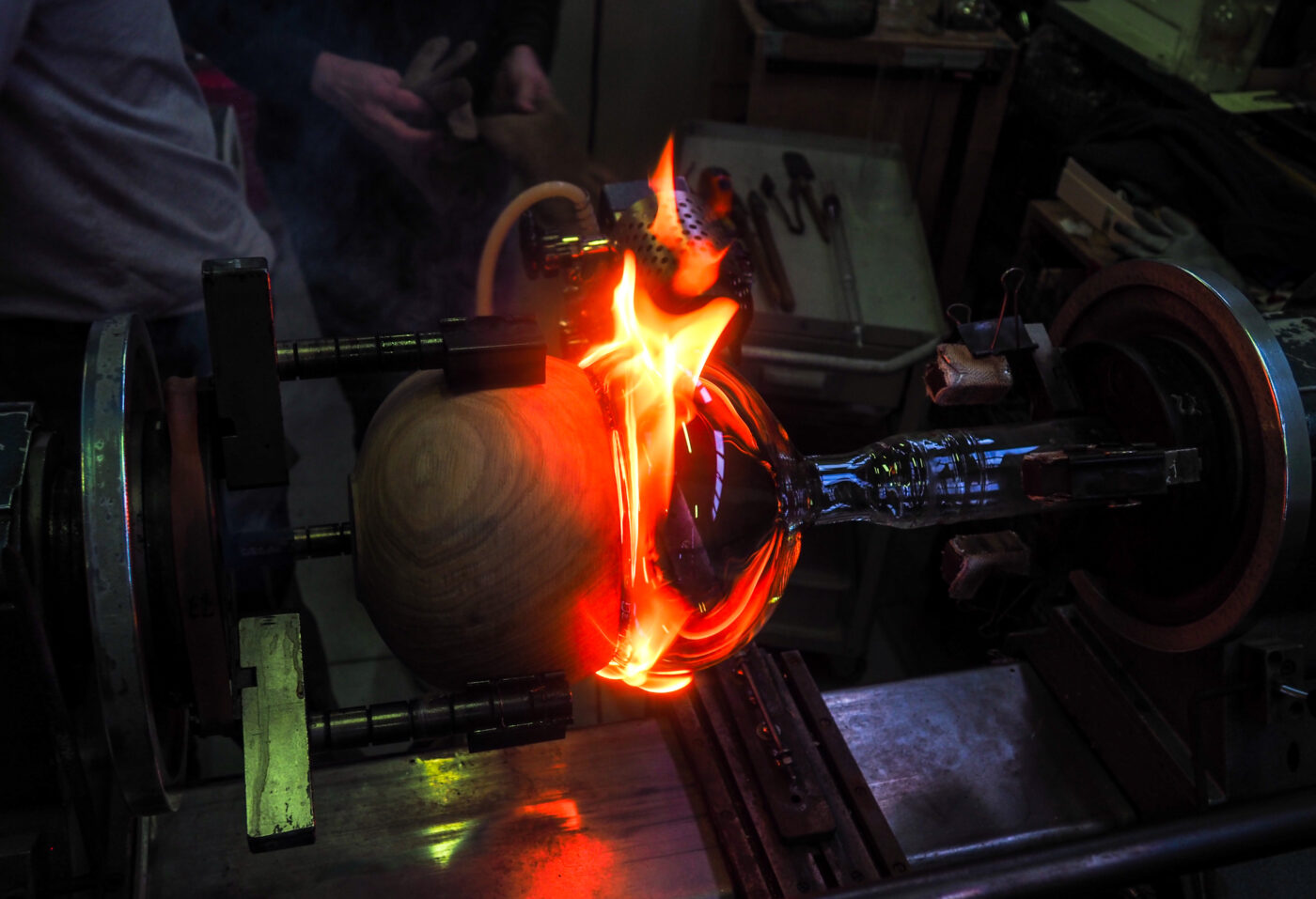 I vasi primitivi sono realizzati in vetro borosilicato soffiato ad una temperatura di 1200°C in contenitori di noce torniti a mano.