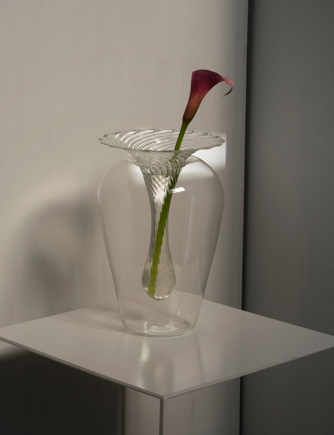 Vaso, costituito da due parti, che esalta la versatilità del vetro borosilicato. Sulla parte inferiore in vetro liscio, soffiato in forma semplice e abbondante, poggia un inserto rigato a forma di goccia per ospitare un bouquet.