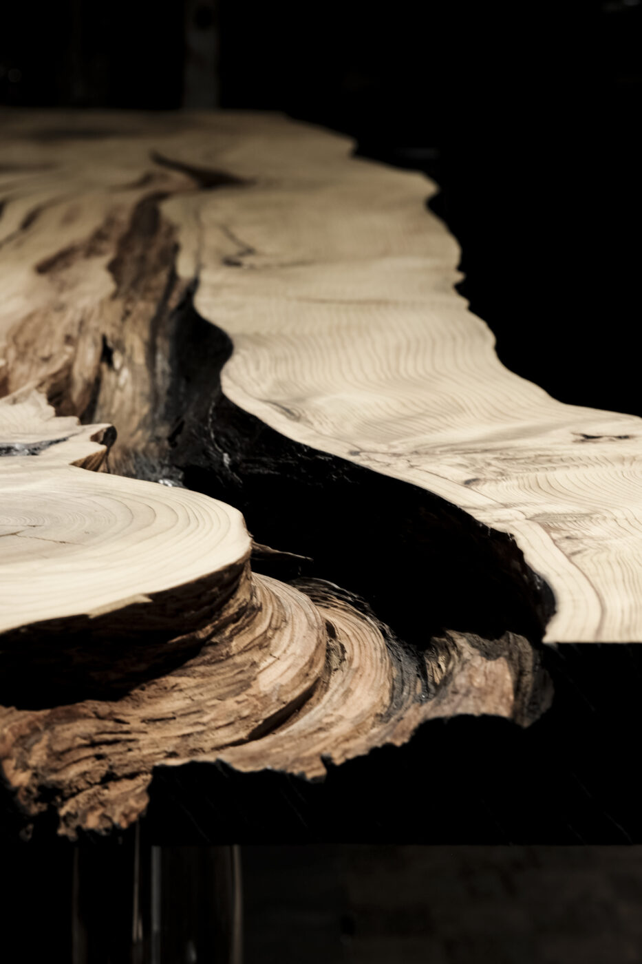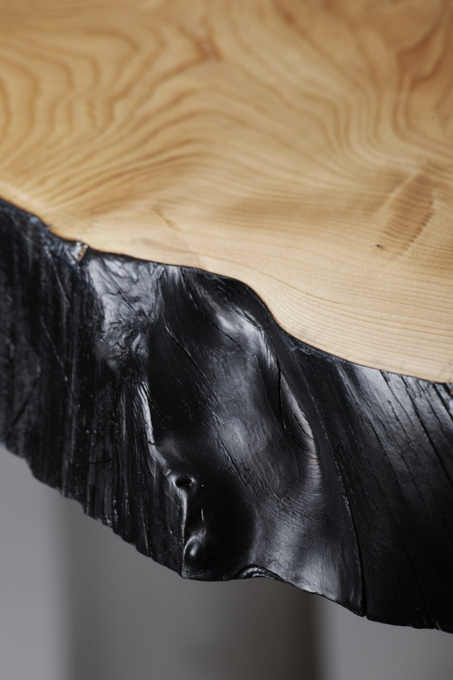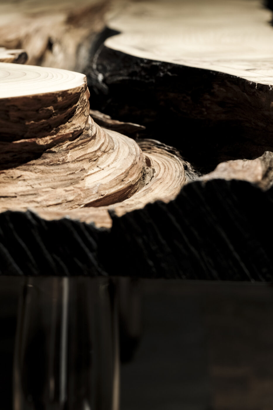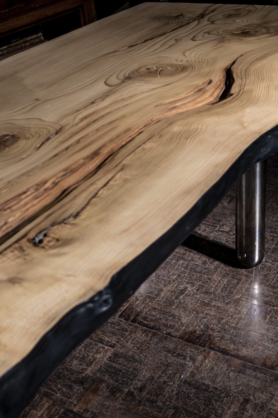 Il tavolo è composto da un piano ottenuto da un tronco di cedro centenario colpito da un fulmine la cui crepa è ancora visibile. Al bordo è stato applicata la lavorazione “Shou-sugi ban”, tecnica giapponese atta a preservare e rifinire il legno attraverso l’uso del fuoco.