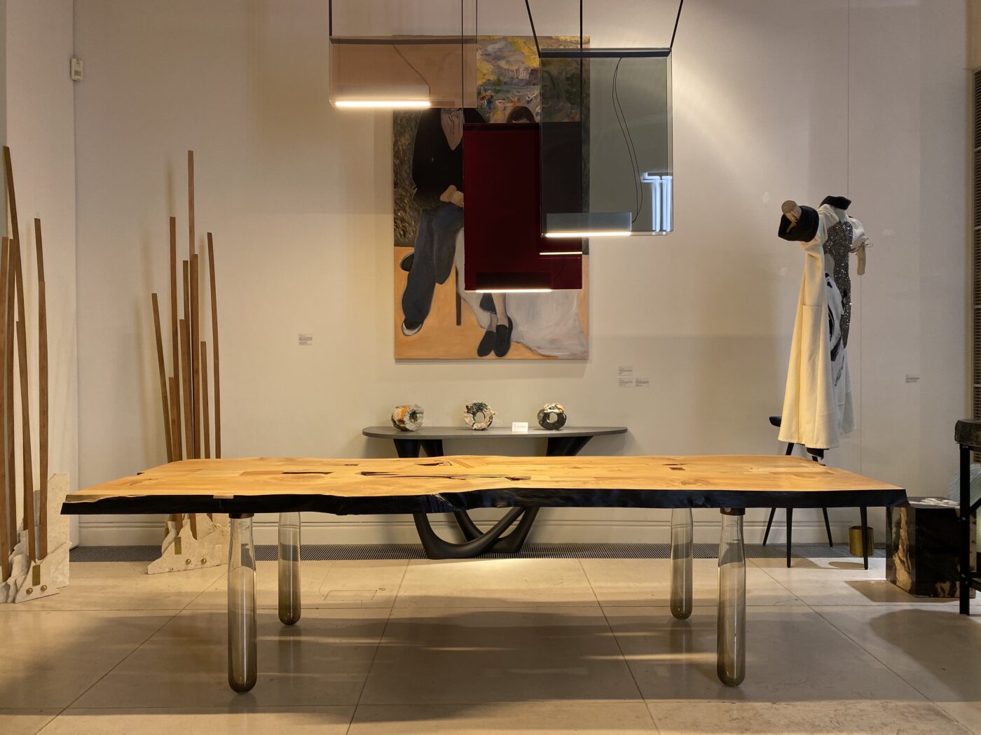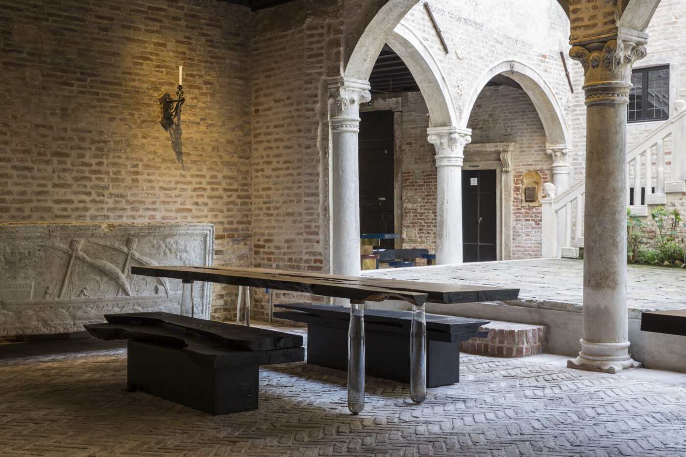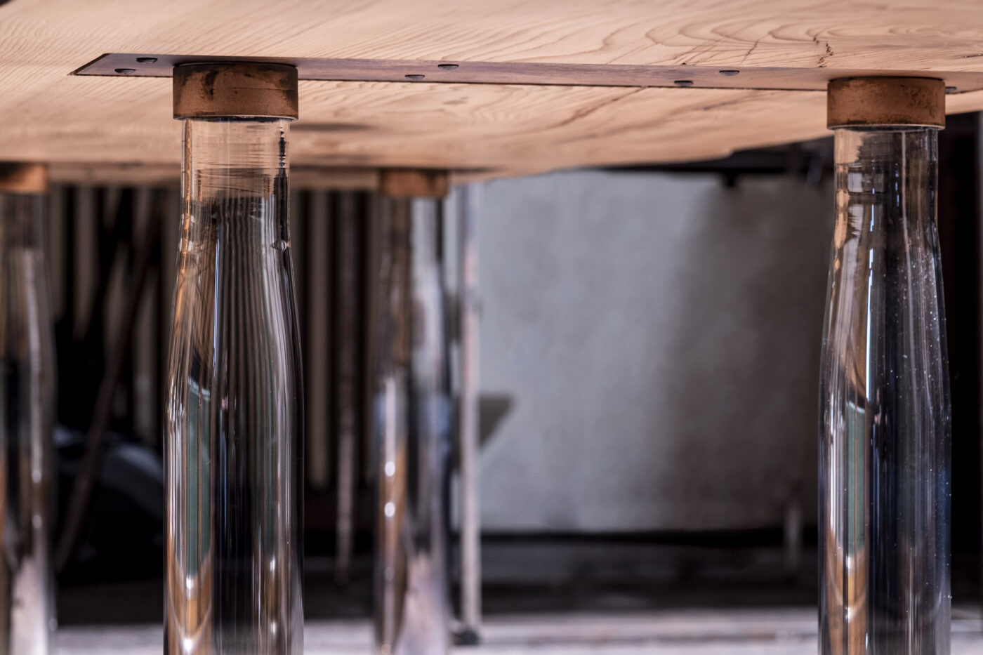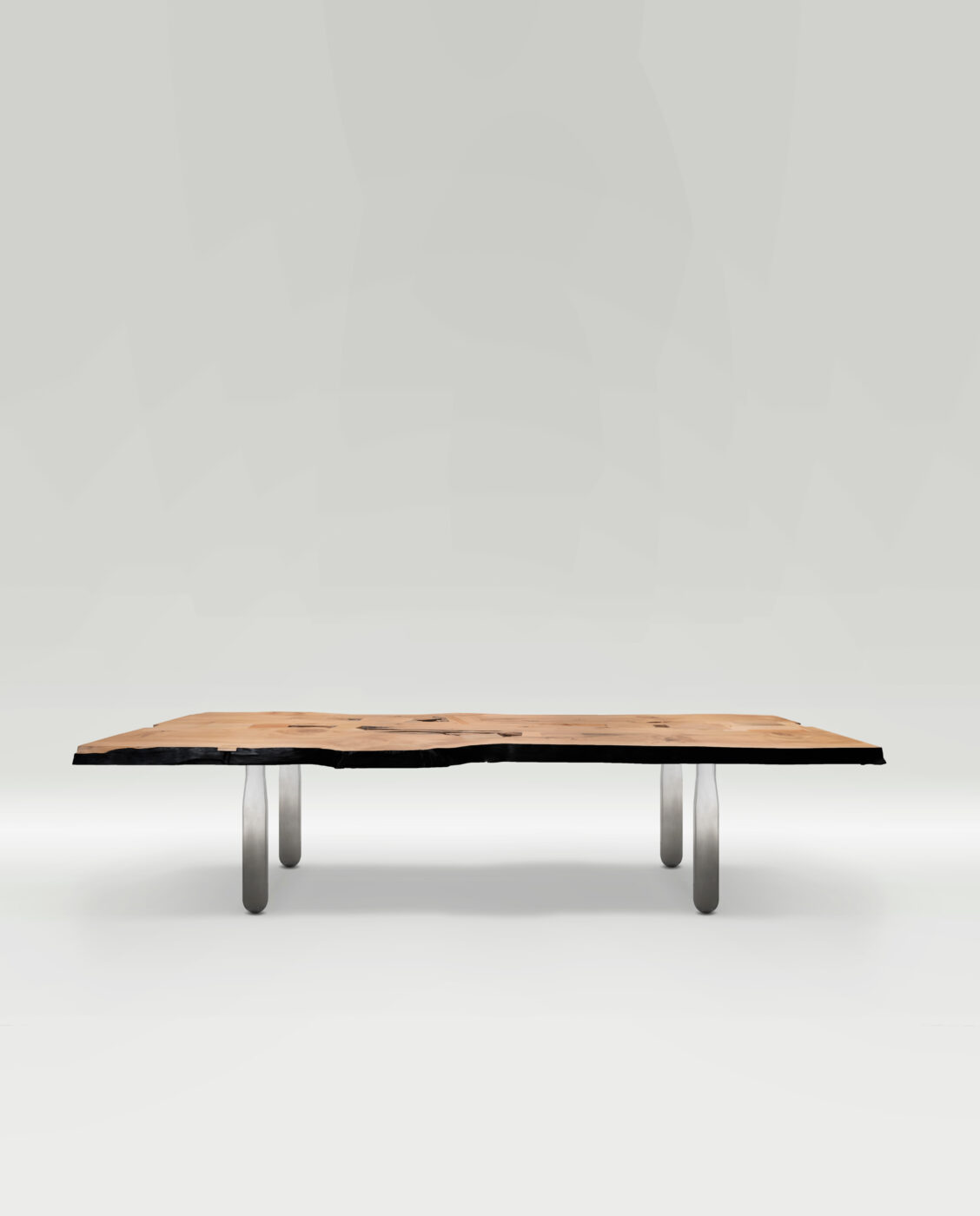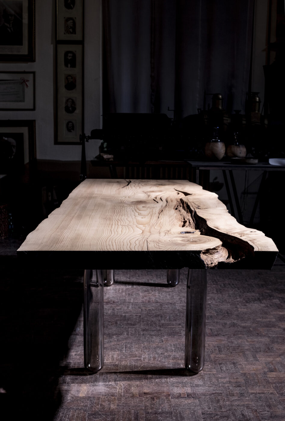 Il tavolo è composto da un piano ottenuto da un tronco di cedro centenario colpito da un fulmine la cui crepa è ancora visibile. Al bordo è stato applicata la lavorazione “Shou-sugi ban”, tecnica giapponese atta a preservare e rifinire il legno attraverso l’uso del fuoco.