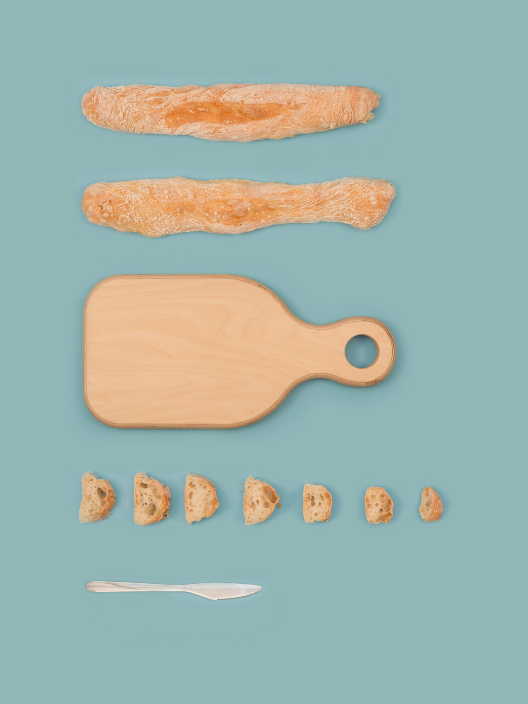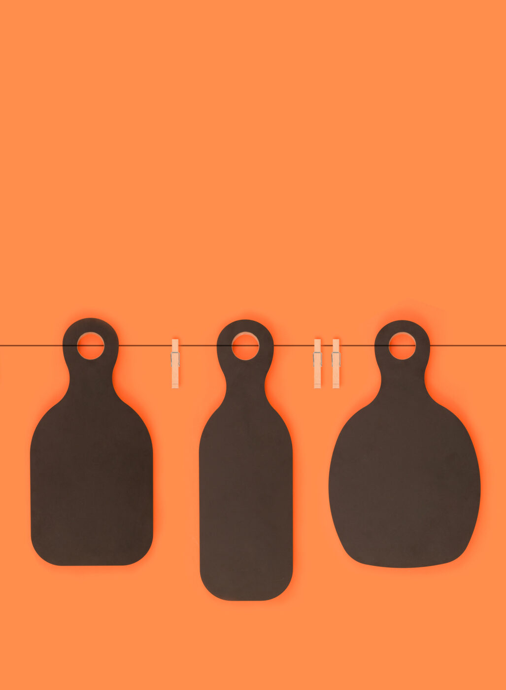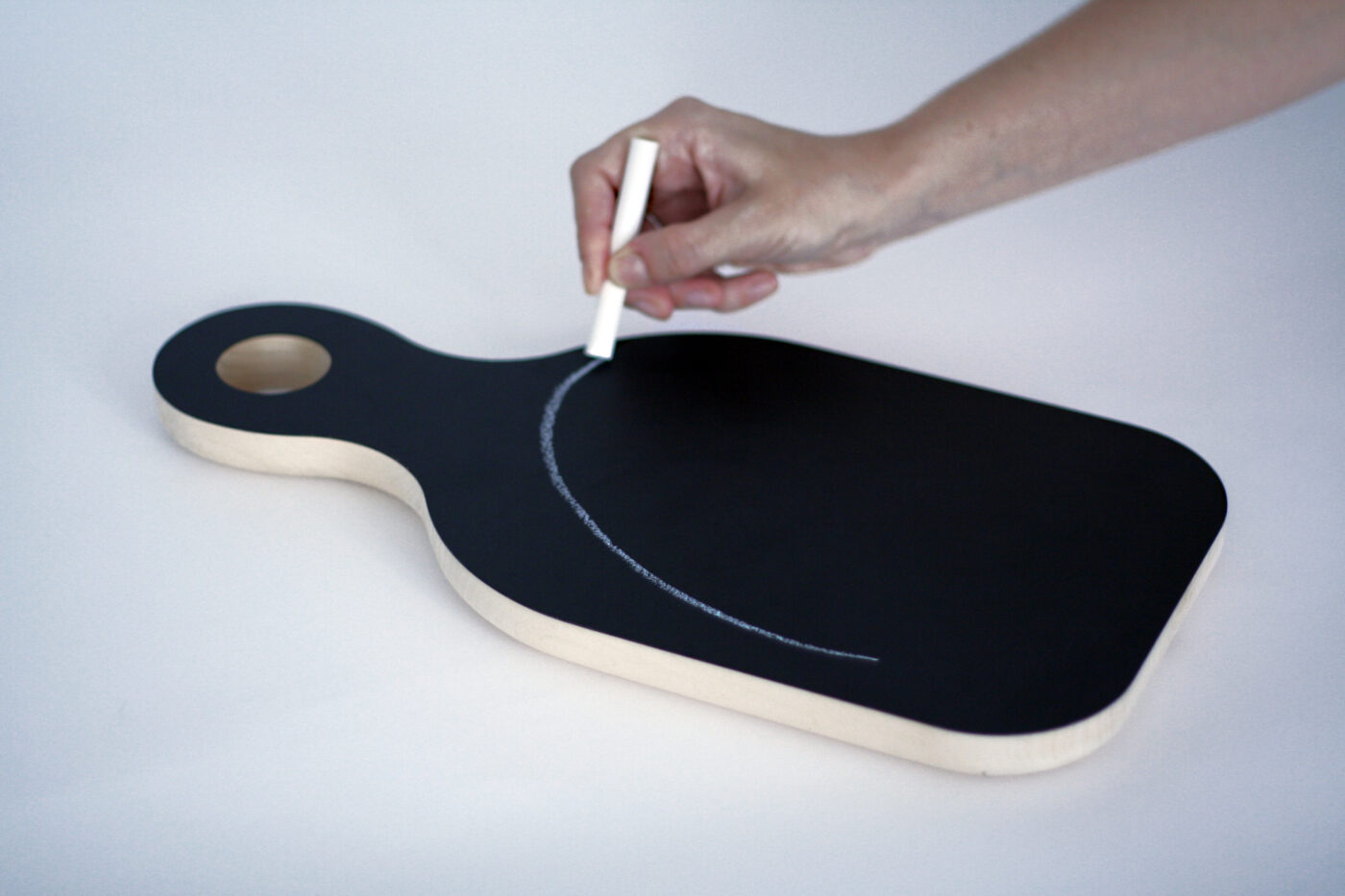 La storia di tutti i giorni si scrive in cucina (e/o alla lavagna). L’idea nasce dall’intenzione di disegnare un tagliere da appendere a parete come si usava una volta, ma va subito oltre e trova un’altra ragione e un’altra funzione. Una delle due facce si riveste di laminato e così l’oggetto appeso al muro diventa una lavagna, mentre voltato sul piano di lavoro ritorna un classico tagliere. Le tre diverse forme sono pensate per adattarsi alla forma dell’alimento da tagliare … anche direttamente in tavola.