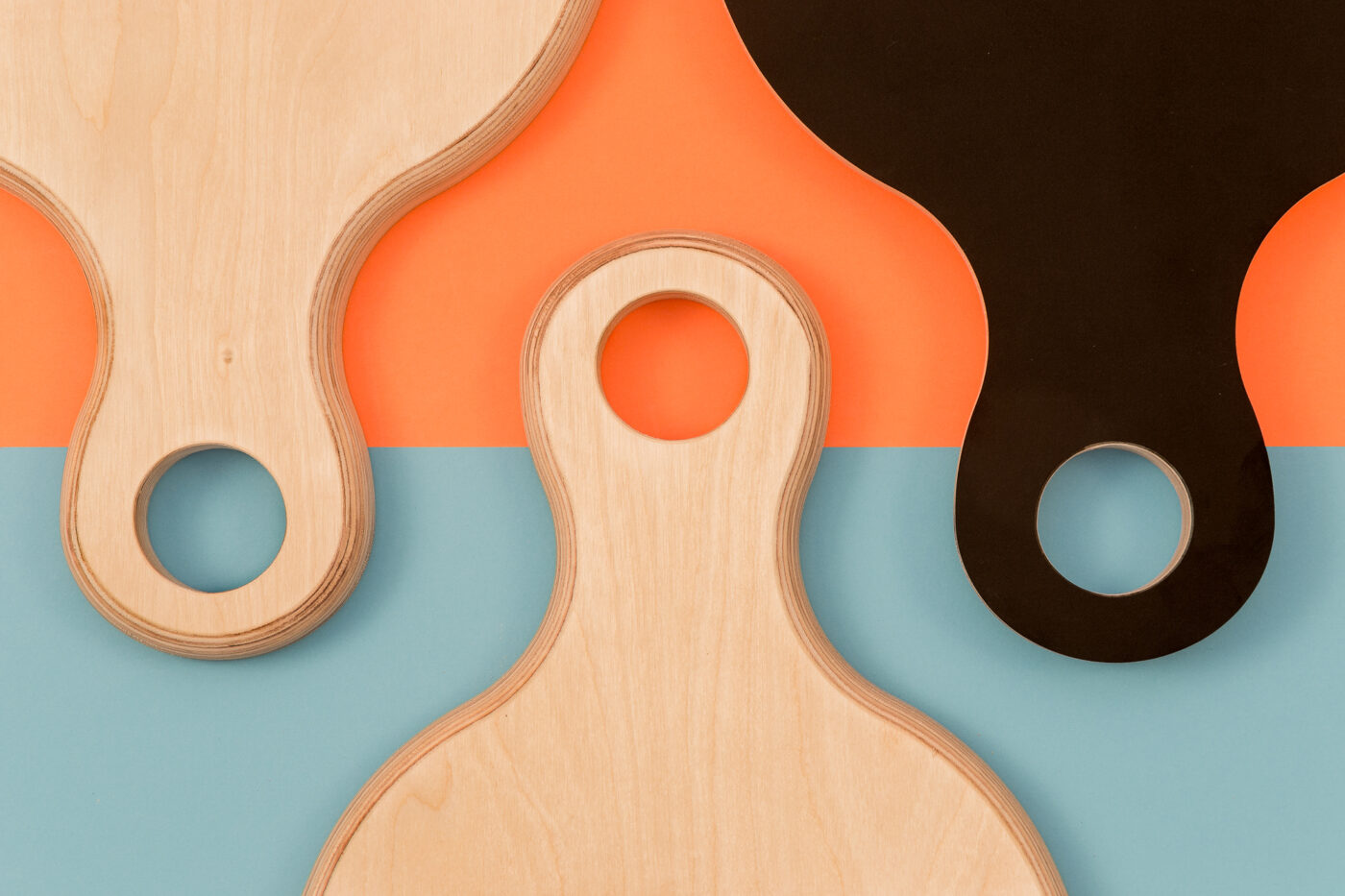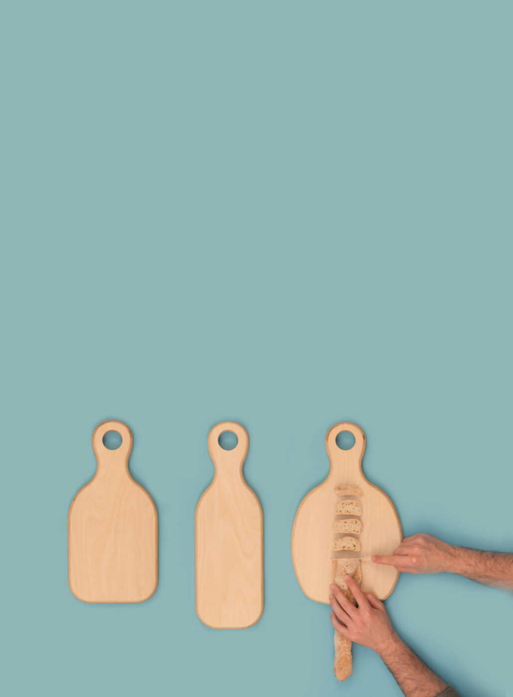 The story of everyday is written in the kitchen (and / or on the blackboard). The idea was born from the intention of drawing a cutting board to hang on the wall as once, but immediately goes over and finds another reason and another function. One of the two faces is covered with laminate and thus the object hanging on the wall becomes a blackboard, while turned on the worktop returns a classic cutting board. The three different forms are designed to fit the shape of the food to be cut … even directly on the table.